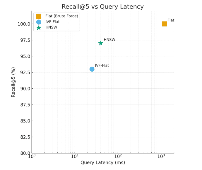 The Flat index delivers exact results but with high latency, whereas HNSW and IVF-Flat balance speed and accuracy for scalable retrieval.