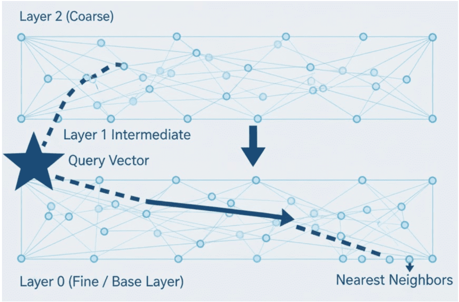 Figure 6: HNSW organizes vectors into multiple graph layers. The query starts at a coarse layer and navigates downward, refining its path at each level until it reaches the base layer to retrieve the nearest neighbors efficiently (source: image by the author).
