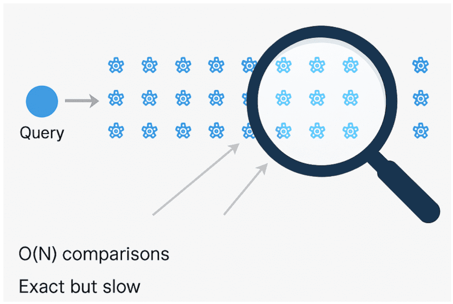 Figure 5: In brute-force vector search, each query is sequentially compared to every stored vector — an O(N) process that ensures exact matches but becomes prohibitively slow for large-scale datasets (source: image by the author).