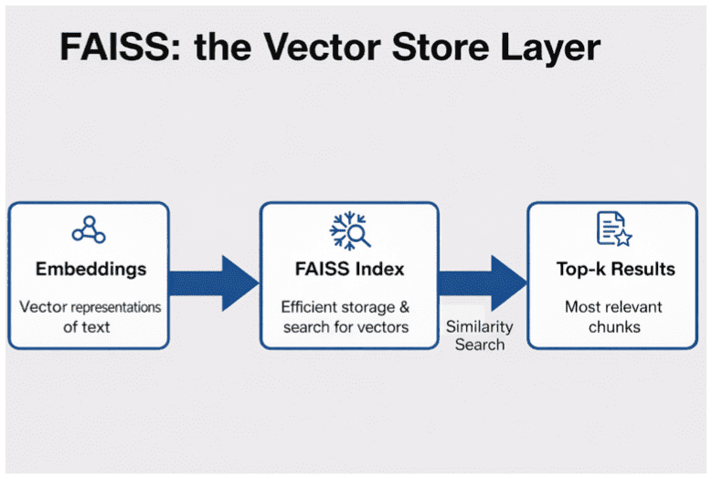 Figure 4: FAISS serves as a high-performance bridge between embeddings and retrieval logic, performing similarity search to return top-k relevant chunks efficiently (source: image by the author).