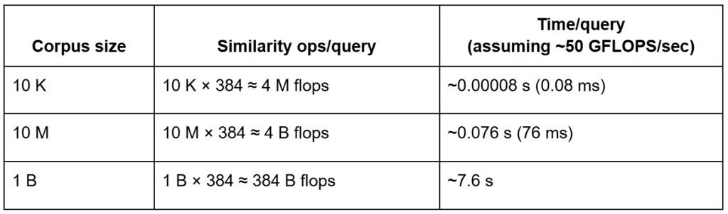 Table 1: Computational cost of brute-force cosine similarity as corpus size scales, assuming ᯈ50 GFLOPS/sec effective CPU throughput.