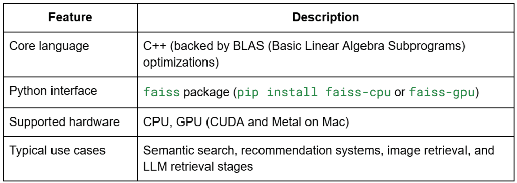In simple terms, FAISS is the NumPy of vector search — it provides a consistent interface for building, training, querying, and persisting vector indexes, with dozens of back-ends optimized for both accuracy and speed.