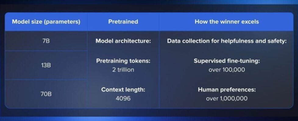 According to Meta, LLaMA outperforms the existing open-source model benchmarks such as Chinchilla-70B and PaLM-540B. The fine-tuned model, Llama-2-chat, leverages publicly available instruction datasets and over 1 million human annotations. Compared to GPT-4 LLaMA is less efficient but it remains the most powerful of all open-source models.