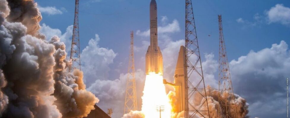 The Ariane 6 rocket lifted off from the Guiana Space Center on the northeastern coast of South America at 11:45 am EST (16:45 UTC), quickly soaring into a clear sky at the tropical spaceport on the power of a hydrogen-fueled main engine and four strap-on solid rocket boosters.