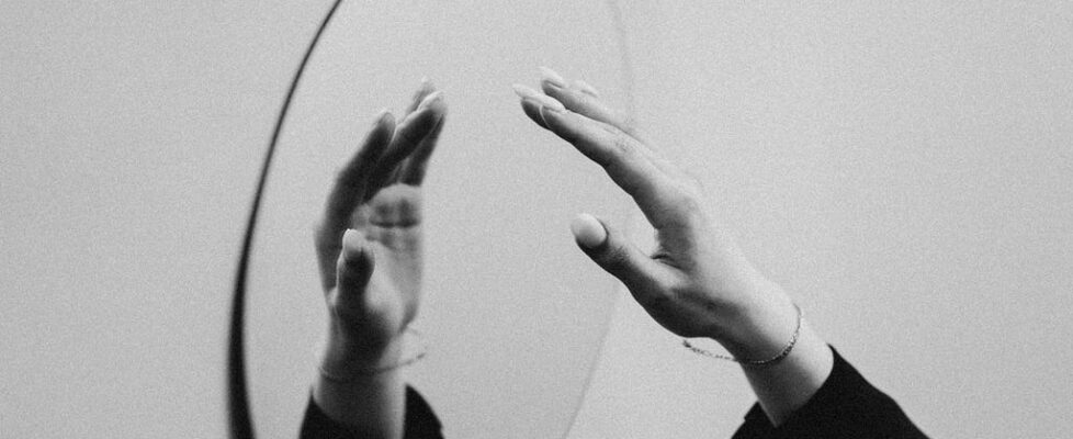 In a monochrome image, a woman’s hand reaches out to touch its reflection in a circular mirror hanging on a wall, the rest of her form beyond the scope of the scene.