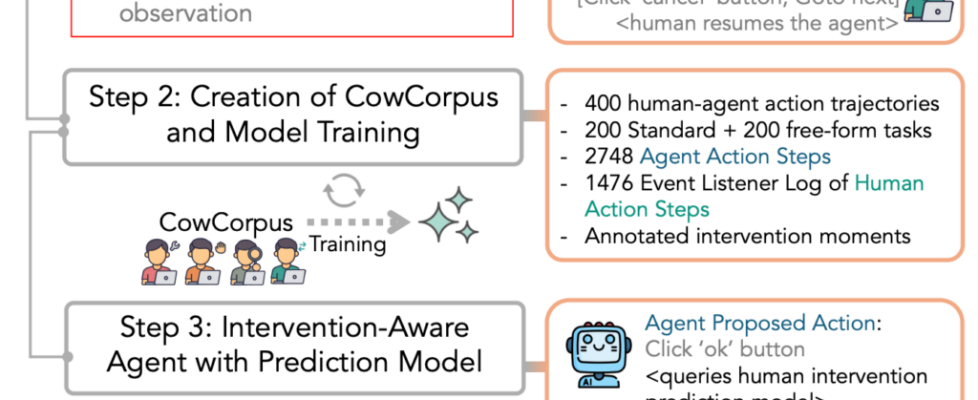 Figure:  In this paper, we present CowCorpus, a dataset of 400 real-user collaborative web trajectories that captures when and how humans intervene during execution, enabling intervention-aware agents that engage users only when needed. First, we curate data using our previous collaborative agent, CowPilot. Second, we curate the data from real-world users. Lastly, we train an intervention prediction model that leads to our new pipeline for intervention-aware agents.