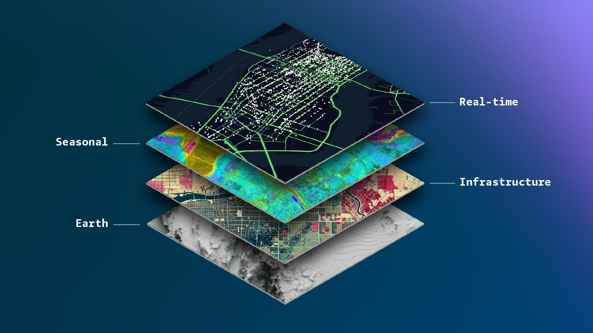 First, there’s the Earth layer, the slow-changing geographical features that remain constant over decades or centuries. The Himalayas or Amazon Basin won’t be moving anytime soon. Then there’s the infrastructure layer roads, bridges, and buildings that evolve over years. Next comes the seasonal layer, which tracks changes in vegetation, water levels, and other environmental factors that shift with the seasons. Finally, there’s the real-time layer, a constantly fluctuating stream of data about human activity, weather patterns, and emergency situations.