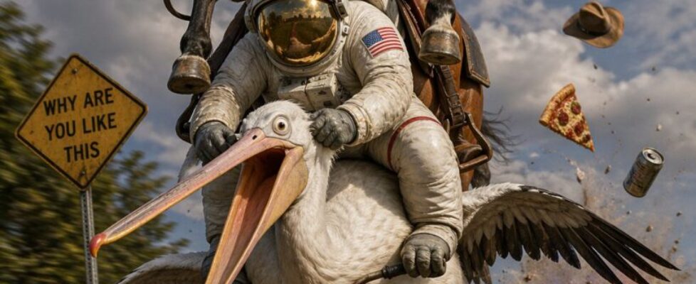 AI generated image. A pelican is riding a bicycle along a dirt track, chased by a police car. The pelican looks panicked, likely because there is an astronaut (with prehensile toes for some reason) riding the pelican clinging on to where its ears should be. The astronaut is being ridden by a horse, with an equally wild expression. A slice of pizza and a can and a cowboy hat are falling next to them. A road sign in the background reads WHY ARE YOU LIKE THIS.