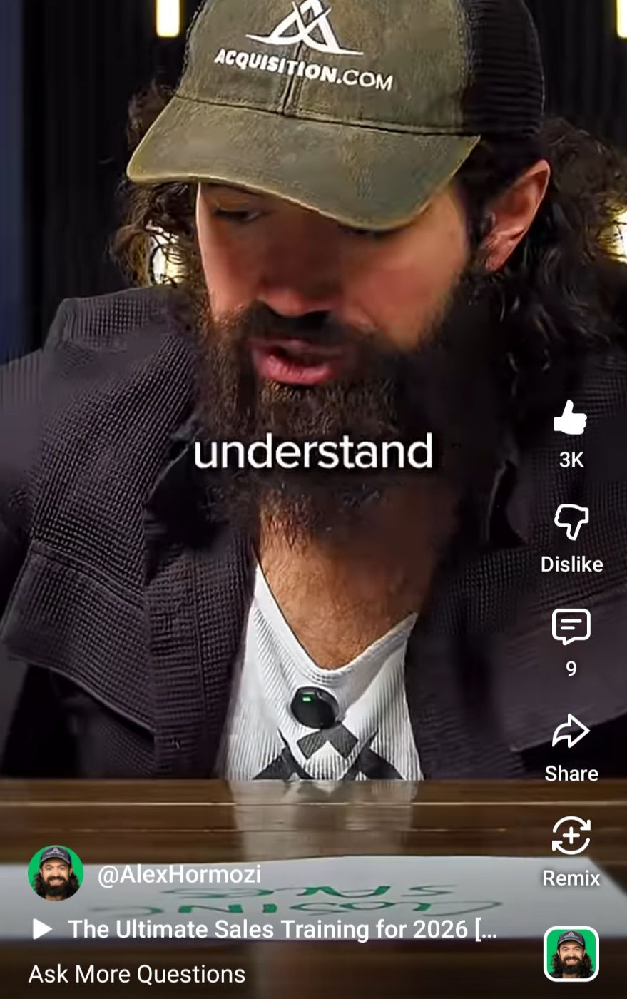 Then I chanced upon Hormozi who said if I ask the questions (whose answers I already know, obviously. Sales people already know the product they’re driving towards), then I get to close a deal with the person I’m asking.