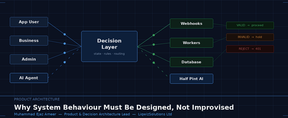 Muhammad Ejaz Ameer is a Product & Decision Architecture Lead working at the intersection of product logic, system behaviour design, and workflow governance. He is the founder of LiqwizSolutions Ltd and works with digital platforms to ensure that product intent is encoded into system behaviour rather than left to informal execution.