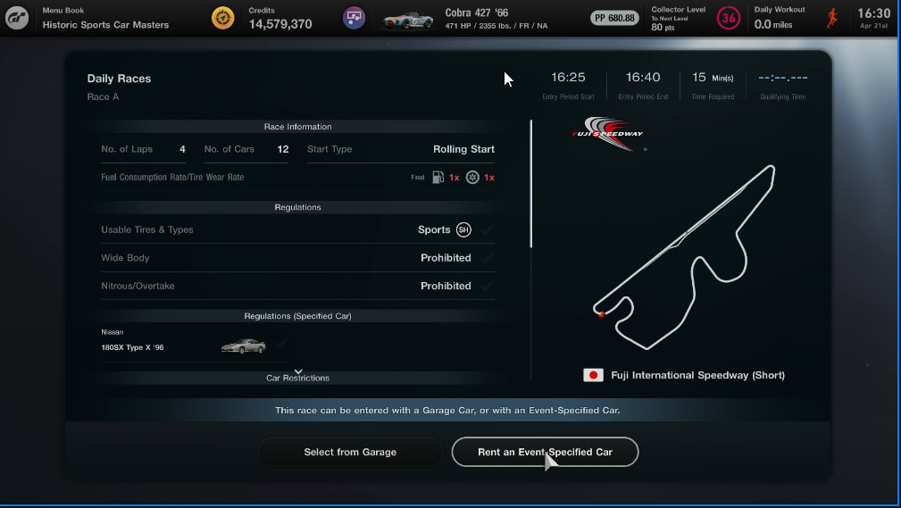 Read the Race A entry requirements: note the car class, the circuit, the number of laps, and the tire compound.