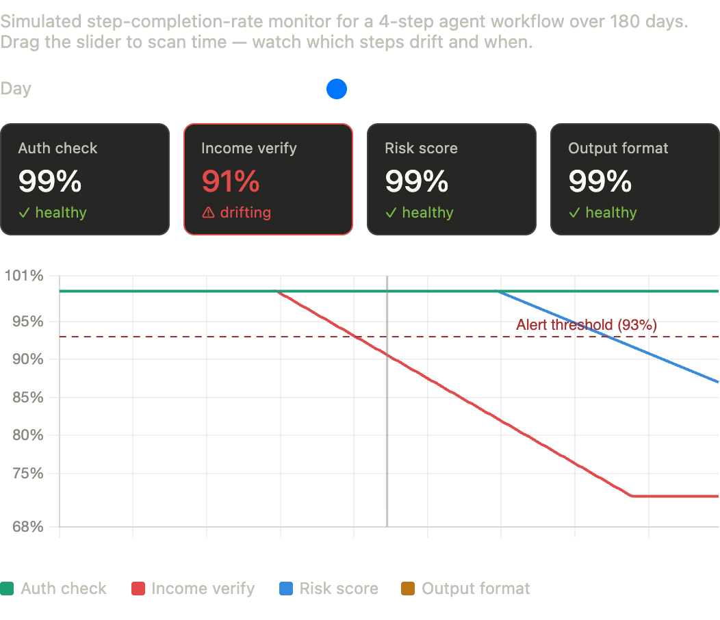 A CIO report from early 2026 describes a credit adjudication agent that illustrated this perfectly. During pilot review, the agent consistently ran income verification before producing a credit recommendation. In production, over months, that verification step started running less consistently — not failing with errors, just getting skipped in edge cases. Output quality looked fine in spot checks. The behavioral drift had been accumulating for months before anyone noticed it in decision quality metrics. With embedding-space monitoring on the agent’s reasoning traces, it would have been visible much earlier.