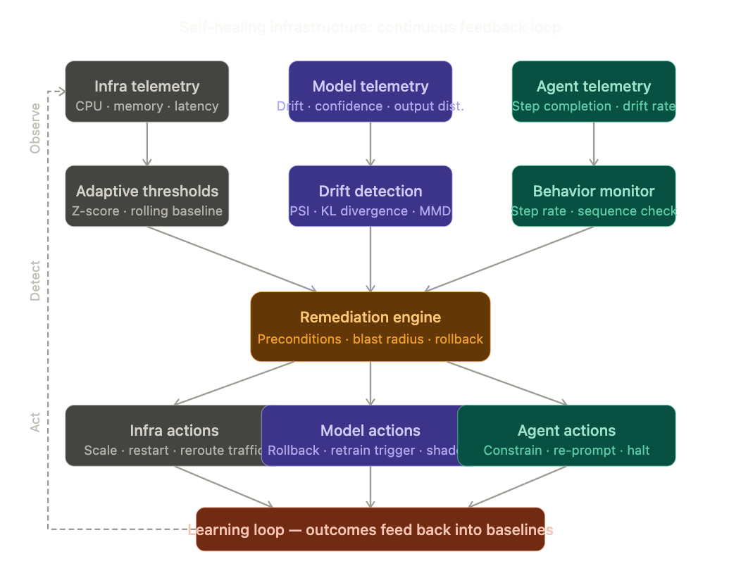 There’s a failure mode here that’s specific to AI systems and worth calling out: model collapse. Oxford, Cambridge, and others have documented what happens when AI models are iteratively trained on outputs generated by previous AI model generations. Each generation inherits and amplifies the artifacts of its predecessors. A 2026 ACM piece documented measurable degradation in deployed tools — background removal, text generation, image synthesis — consistent with this pattern. Systems trained on AI-generated data progressively lose range and accuracy. Infrastructure that doesn’t track data provenance and output distribution over time will not detect this until quality has already degraded significantly. This is a feedback loop that runs in the wrong direction, and self-healing infrastructure needs an explicit circuit breaker for it.
