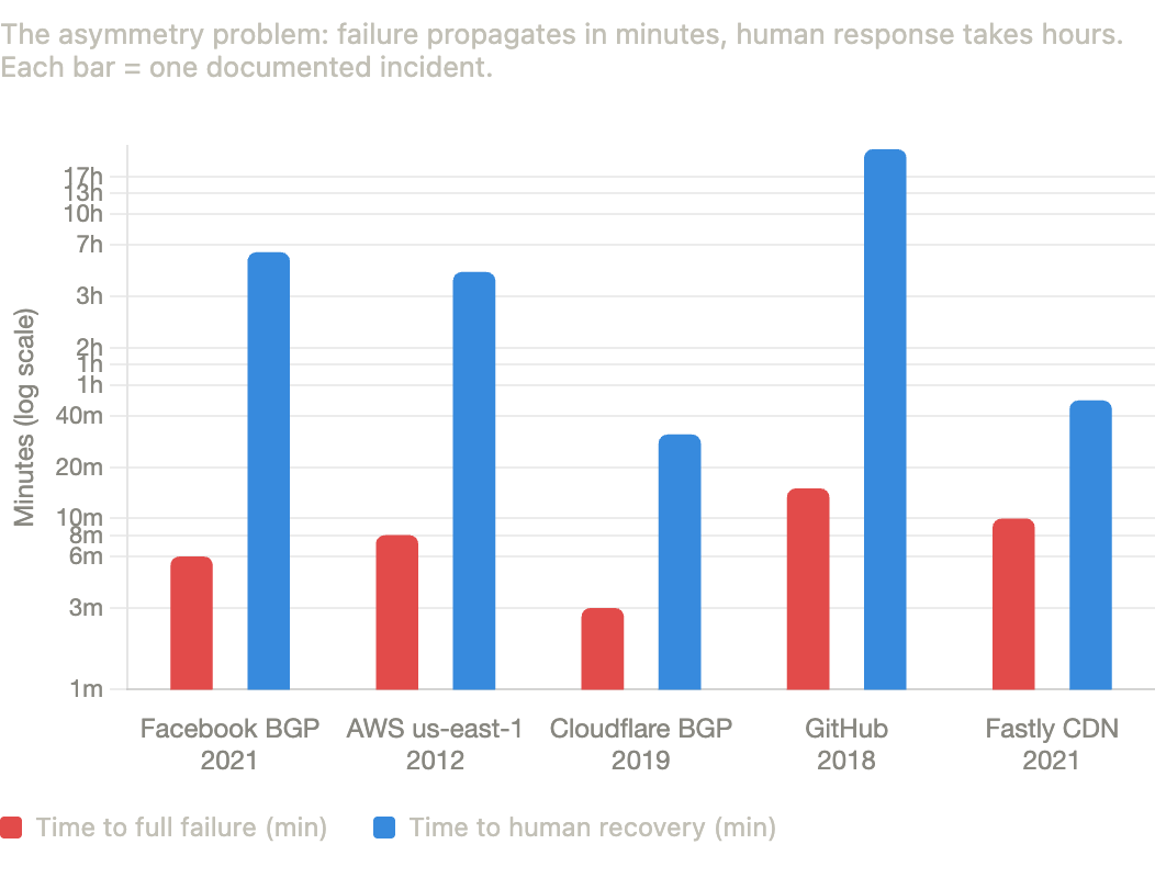 The October 2021 Facebook outage is the canonical case study for where reactive recovery breaks down. A BGP misconfiguration cascaded across Facebook’s backbone in seconds, taking down their internal tooling along with everything else. By the time engineers could act, they couldn’t reach the systems they needed to fix. Physical access to data centers was required. Six hours, roughly $60M in lost revenue, and the humbling discovery that their own infrastructure had made it impossible to fix itself remotely. You can’t reactively recover from a failure that cascades faster than your recovery mechanisms can respond. You have to predict it.